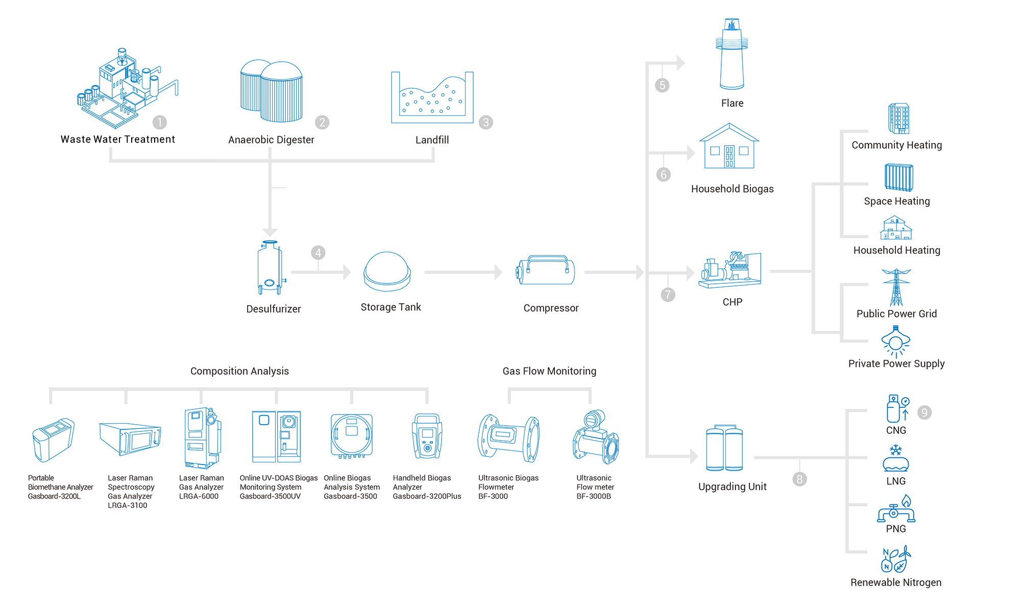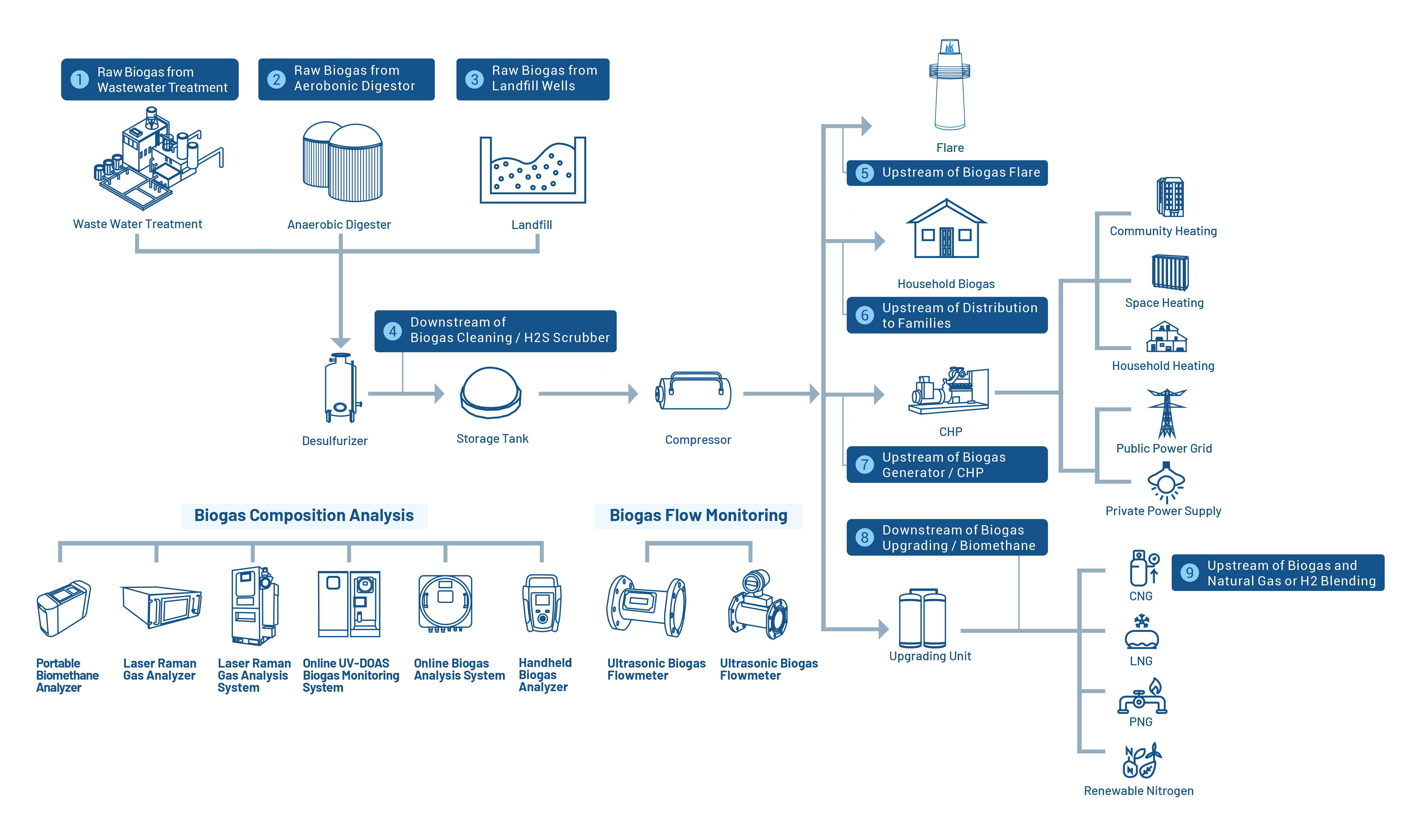 Biogas, a renewable energy source produced from industrial, agricultural, and municipal waste, is gaining increasing global attention. A growing number of anaerobic digestion systems and landfills are being built or planned to produce biogas from wastes such as sugarcane bagasse, alcohol vinasse, palm oil mill effluent, food waste, livestock manure, and wastewater sludge for heat and power generation. To optimize biogas production, prevent potential hazards, and ensure the reliable operation of power and heat engines, it is essential to monitor gas composition in real time throughout the process. From production and treatment to end-use applications, every stage of the biogas value chain relies on accurate gas analysis. With over 20 years of experience in biogas analysis, Cubic Instruments has developed a comprehensive range of biogas analysis instruments, capable of measuring CH4, CO2, H2S, CO, H2, and O2 at various stages of the biogas process.